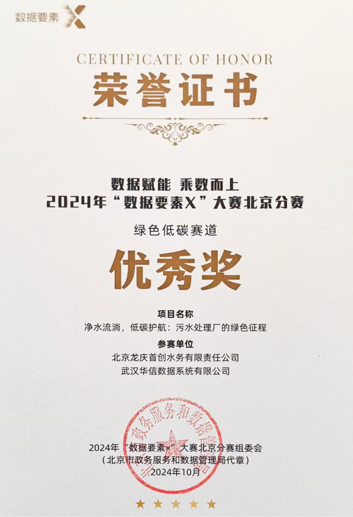 近期,由国家数据局等部门举办的首个聚焦数据要素开发应用的全国性大赛 ——2024 年“数据要素 x”大赛正式发布获奖结果。武汉韦德国际1946韦德数据系统有限公司与北京龙庆首创水务有限责任公司合作的项目“净水流淌,低碳护航:污水处理厂的绿色征程”在高手如云的北京分赛区脱颖而出,荣获优秀奖。